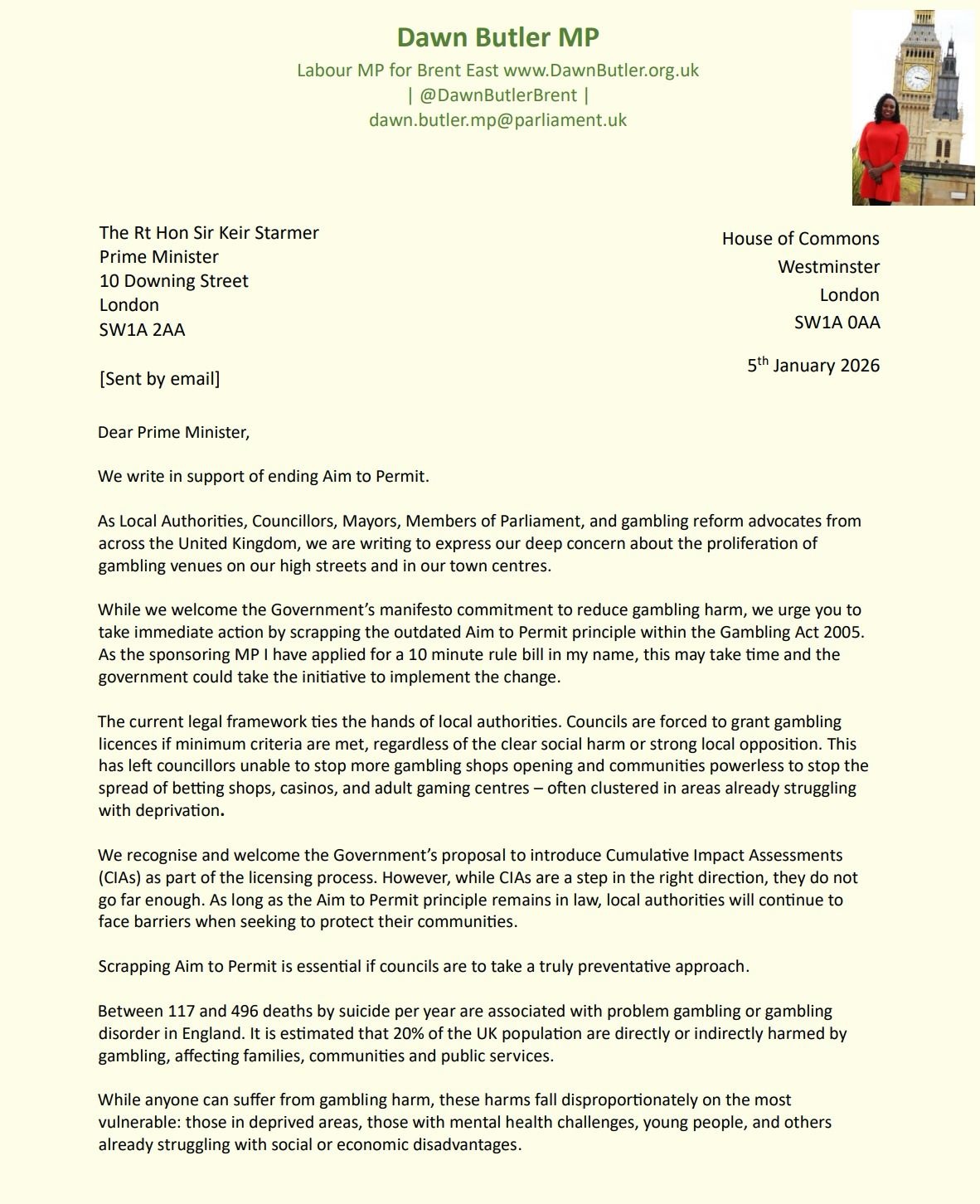 Dawn Butler MP leads cross-party coalition of 280 leaders urging the Prime Minister to scrap ‘Aim to Permit’ and protect communities from gambling harm.