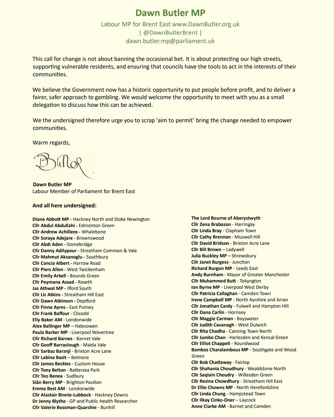 While welcoming the Government’s manifesto commitment to reduce gambling harm, signatories urge ministers to act now by scrapping Aim to Permit. With this large cross-party support, Dawn Butler MP has applied for a Ten Minute Rule Bill to end Aim to Permit.