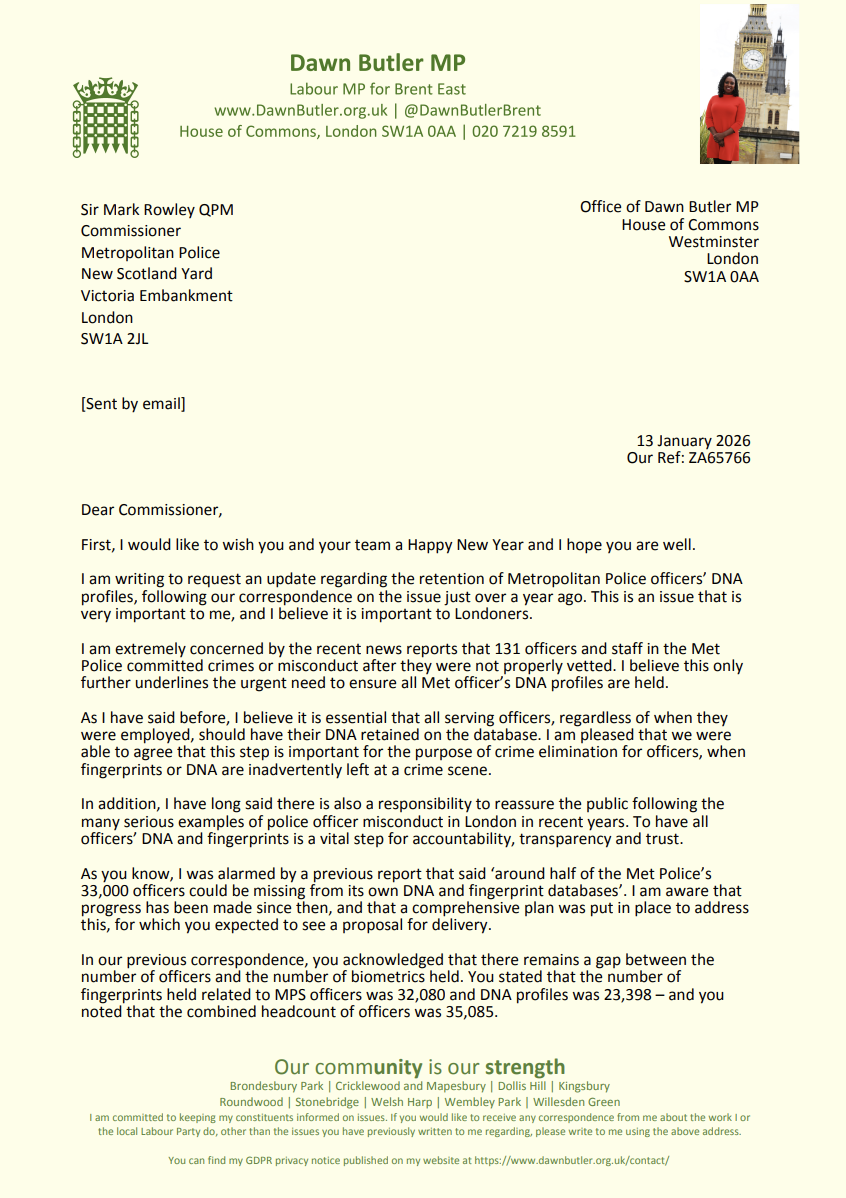 In January, I wrote to the Commissioner of the Metropolitan Police to raise serious concerns about the retention of officers’ DNA and fingerprint records. My letter highlighted that a significant number of officers were missing from the Met’s biometrics databases, which is essential both for effective crime detection and for maintaining public trust and accountability. I stressed that all serving officers, regardless of when they joined, should have their DNA and fingerprints retained to prevent gaps that could compromise investigations and reassure Londoners in light of past misconduct cases.