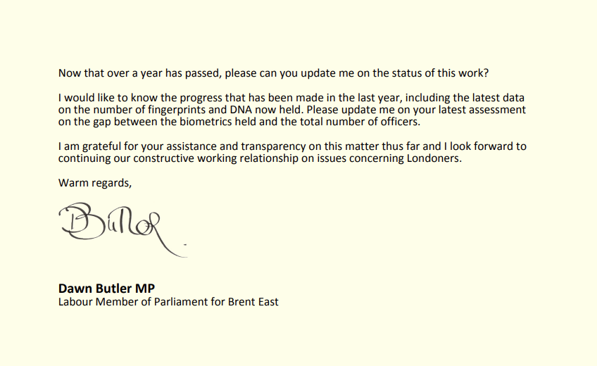 As you know, I was alarmed by a previous report that said ‘around half of the Met Police’s 33,000 officers could be missing from its own DNA and fingerprint databases’. I am aware that progress has been made since then, and that a comprehensive plan was put in place to address this, for which you expected to see a proposal for delivery.